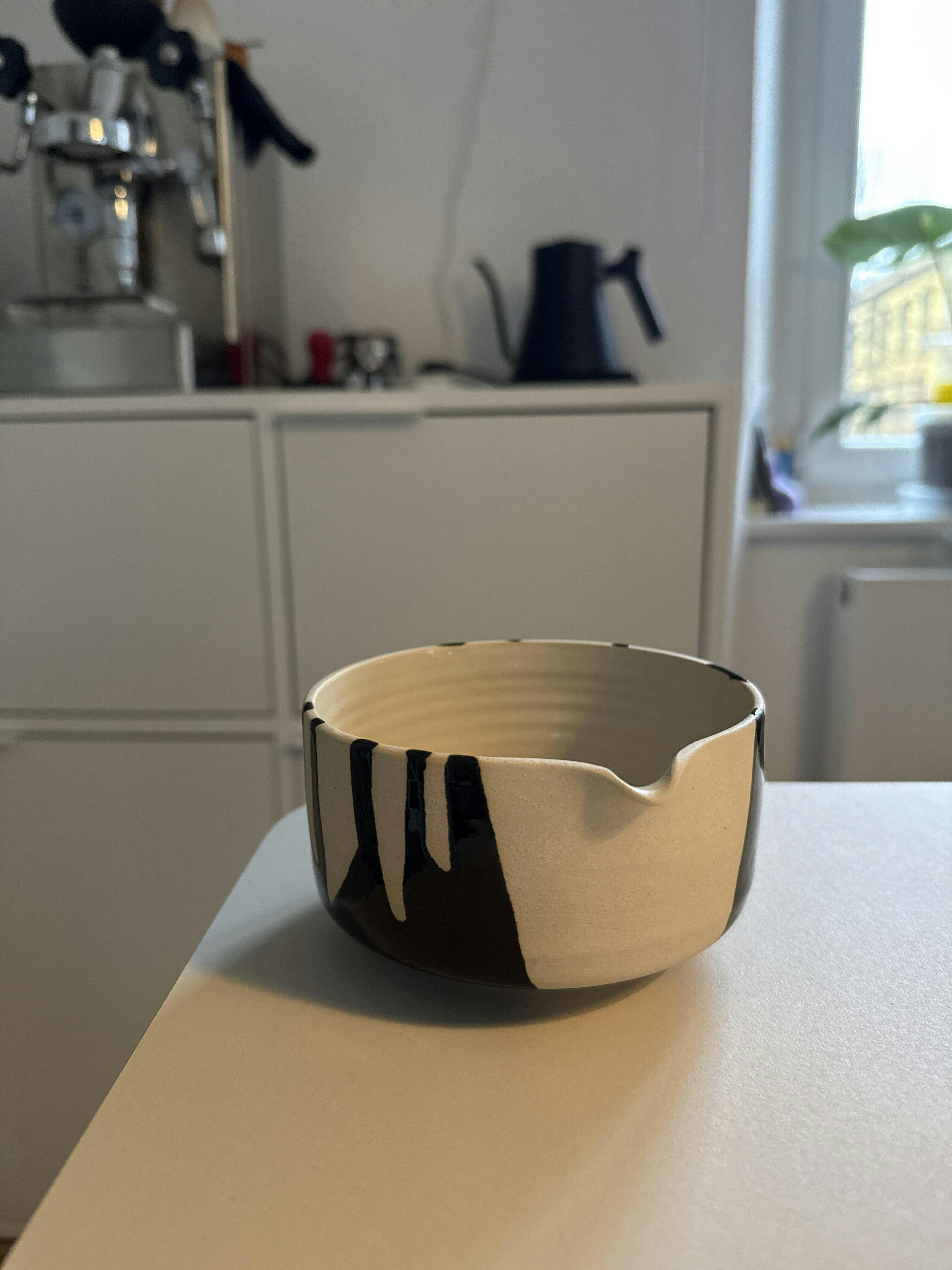 Diese Matcha-Gießschale ist aus grauem Steinzeugton gefertigt. Die Innenseite ist mit einer transparenten, glänzenden Glasur versehen; die Außenseite ist teilweise in einem tiefen, glänzenden Schwarz glasiert. Mit dem kleinen Ausgießer kannst du deines zubereiteten Matcha ganz einfach ausgießen - in eine Tasse deines Wahl.